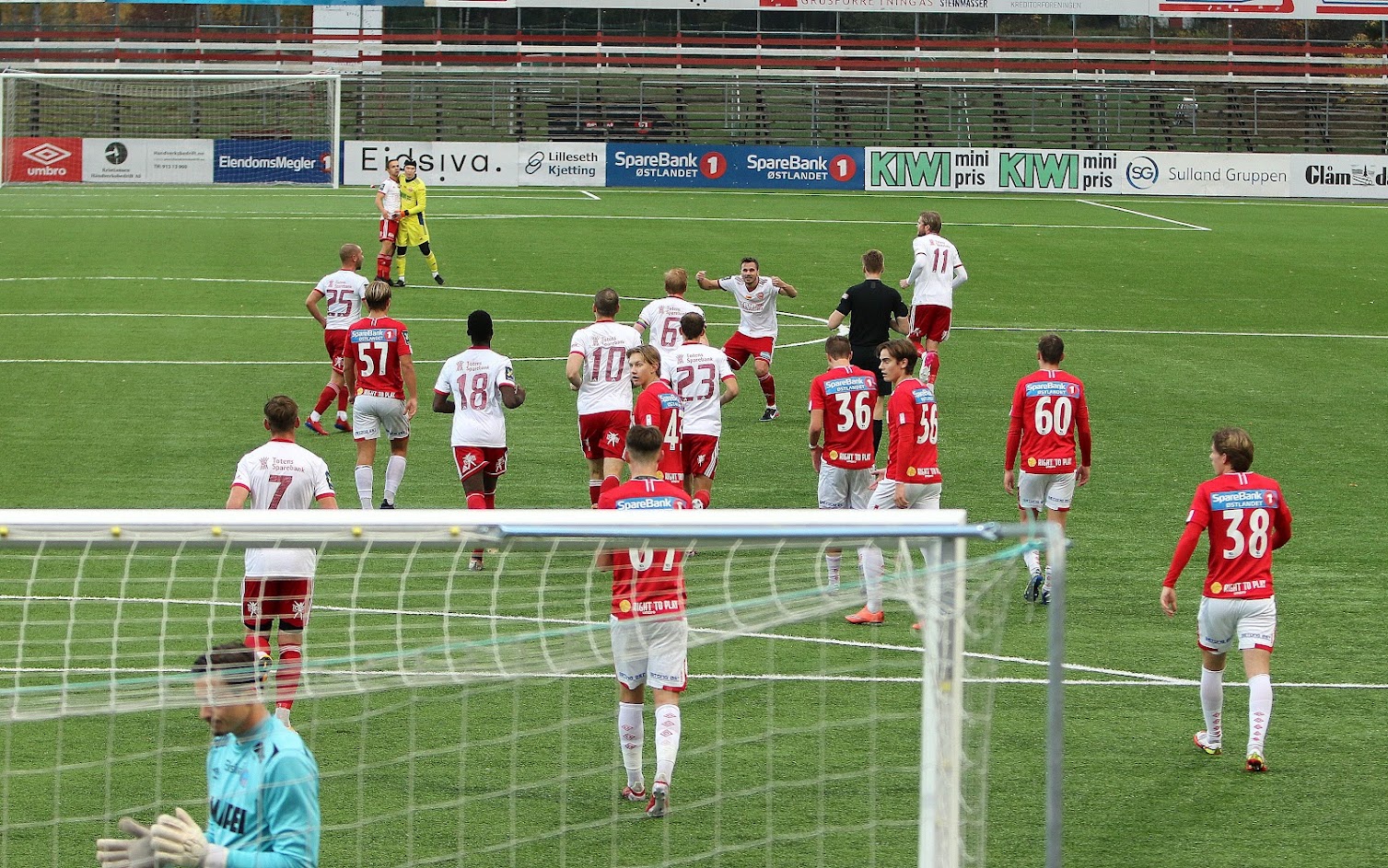 Baklengsmålet ser ut til å vekke laget vårt litt, og vi løfter oss flere hakk de neste minuttene. Syv minutter etter Kongsvinger sin scoring er det vår tur til å få frispark i brukbar posisjon. Lars Johan Kollshaugen stiller seg opp for å ta dette, og han gjør det som han har gjort så mange ganger tidligere – skrur ballen med millimeters presisjon over muren, den treffer tverrliggeren helt oppe i vinkelen, og går i mål. Vi fortsetter å trykke på etter scoringen. Simen Engelien løper seg fri og får skutt fra skrå vinkel, men uheldigvis for vår del går ballen i treverket og ut denne gangen. Stillingen er dermed 1-1 når dommeren blåser av etter de første 45 minuttene.
